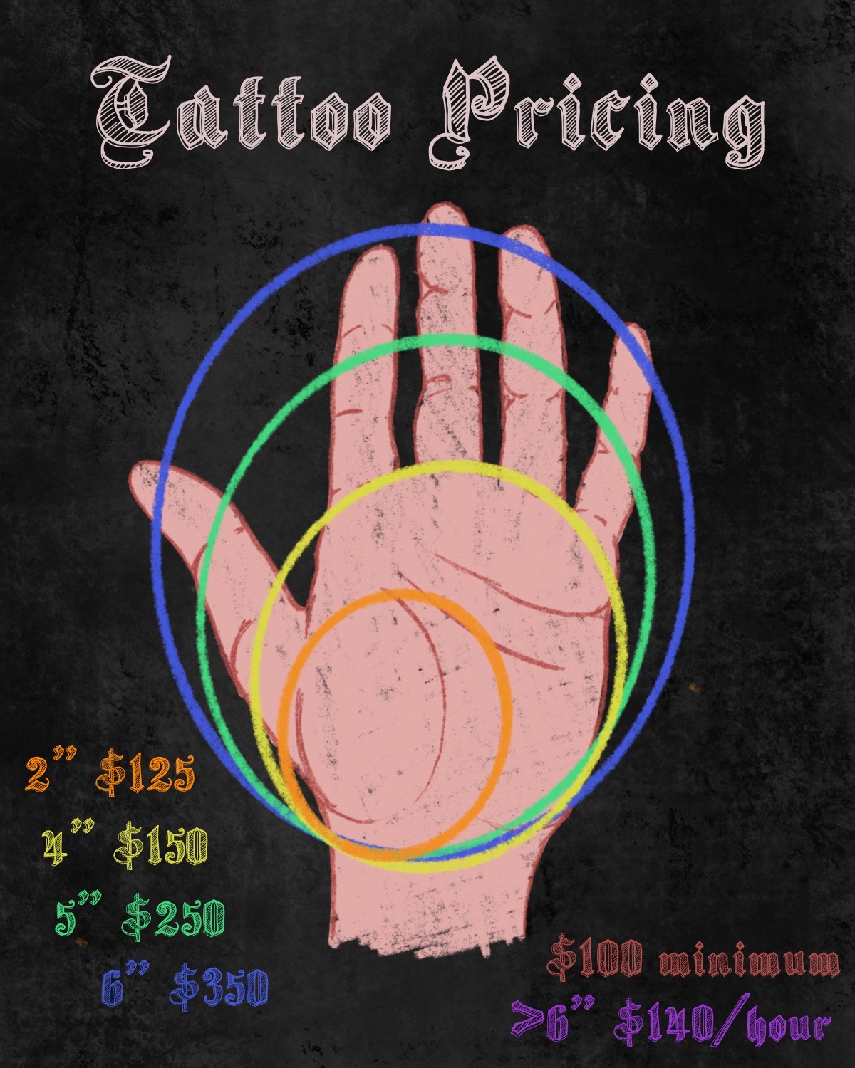 Minimum is $100 for any tattoo. Large scale, multi-session tattoo rate is $140/hour.